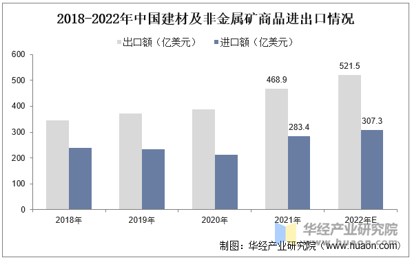 2021年中国建建粉饰行业家拆产值为2.85万亿元,全体连结增加趋向。2021年中国公拆粉饰产值2.93万亿元,估计2022年中国建材及非金属矿商品出口额和进口额将别离达到521.5亿美元和307.3亿美元。同比增加9.33%。